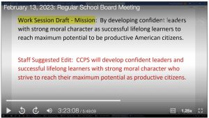The vision and mission statements and school board priorities were developed collaboratively at a Jan. 30 work session led by Sandra Eaton, CCPS Chief of Staff, and modified after further discussion at the subsequent Feb. 13 school board meeting. Watch the recording of the work session here and the board meeting here.